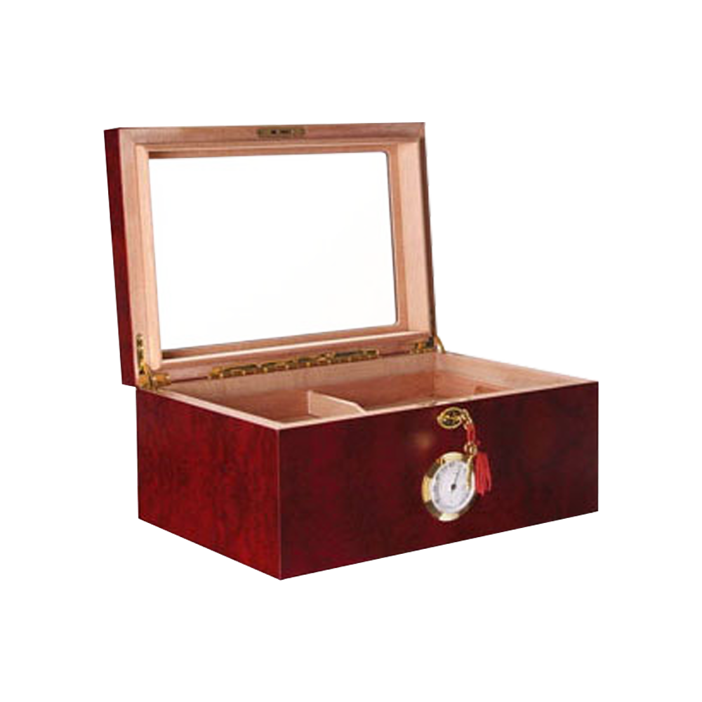 Check out our sleek 100-120 Stick Glass Top Humidor, the ultimate display case and fortress for your cigars. Its clear top lets you proudly show off your collection, while the Spanish cedar tray inside ensures optimal humidity for peak flavor. Plus, it's secure with a lock and key, so your prized smokes are always protected.