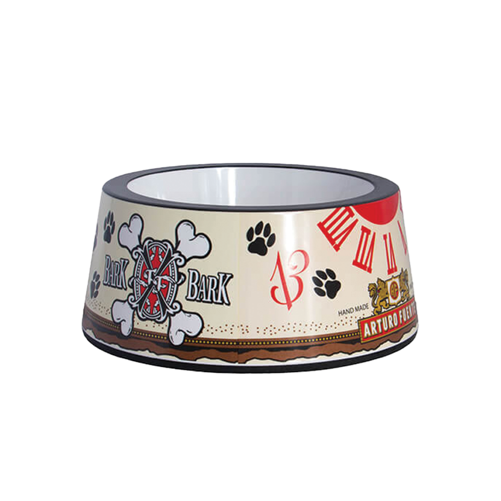 Introducing the Arturo Fuente FFOX Bark Bark Dog Bowl. It's part of the Fuente Dog Pound Collection, made of durable melamine with a sturdy rubber base. Perfect for both food and water, indoors or outdoors. Holds 40 US fluid ounces, measuring 9 inches round and 3.85 inches high. Not for microwave or dishwasher use due to the intricate graphics and material. Treat your furry mate to the best today!
