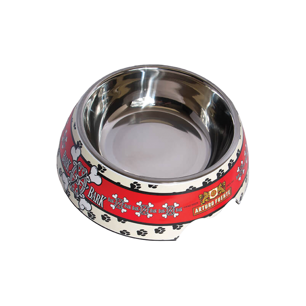 Introducing the Arturo Fuente FFOX Bark Bark Dog Bowl. It's part of the Fuente Dog Pound Collection and crafted from durable melamine. With a sturdy rubber base and removable stainless steel insert, it's perfect for food or water, indoors or outdoors. Holds 24 US fluid ounces and the stainless steel insert is dishwasher safe. Treat your furry friend to the best today!