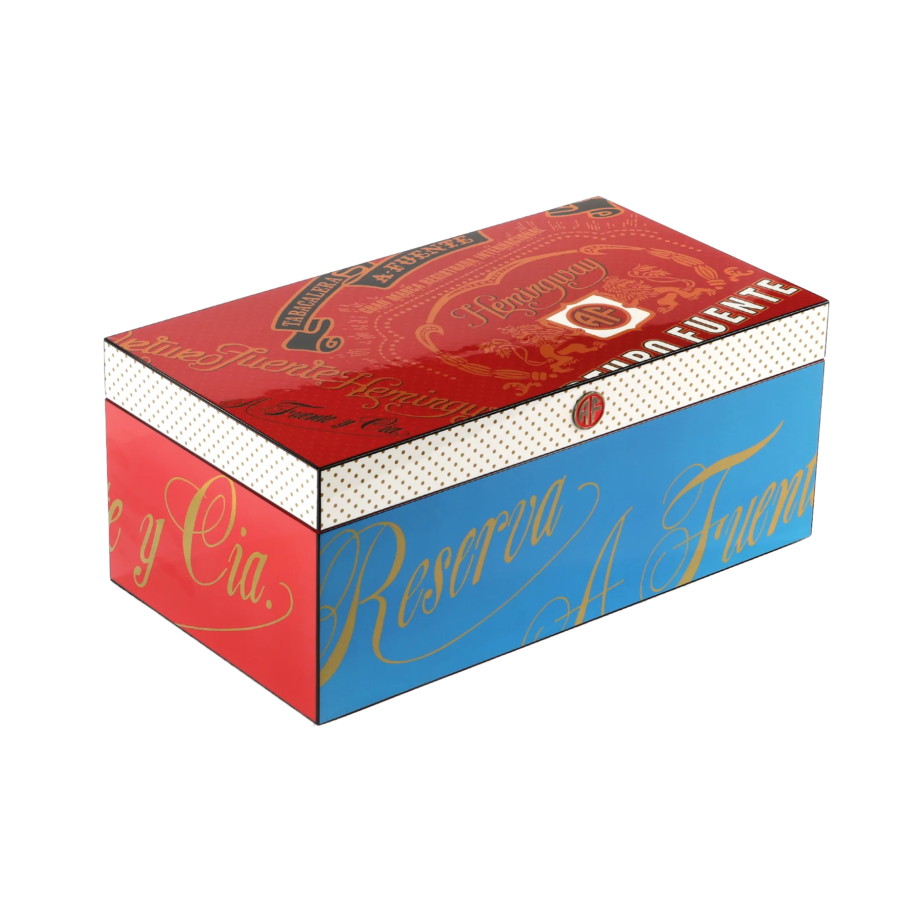 Discover the elegance of the Arturo Fuente Hemingway Humidor, a centerpiece designed for the discerning cigar lover. This striking humidor holds 100-120 cigars and features vibrant, Fuente-specific designs, perfect for any home or office. It's equipped with a Boveda 2-Step humidification system to keep your cigars in prime condition—just start with the 84% humidity packs and switch to the 69% to maintain perfect moisture levels.