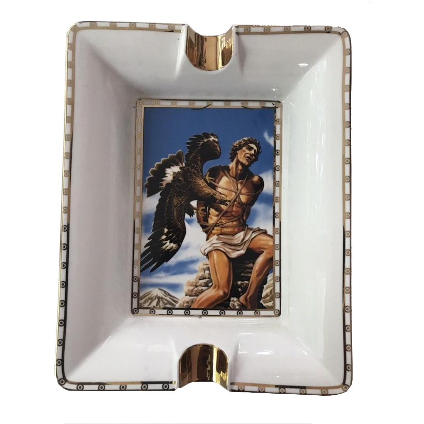 This ceramic ashtray is finished with a detailed rendering of Prometheus Bound, the iconic painting of Prometheus tied to the rock as punishment for stealing fire from the gods.