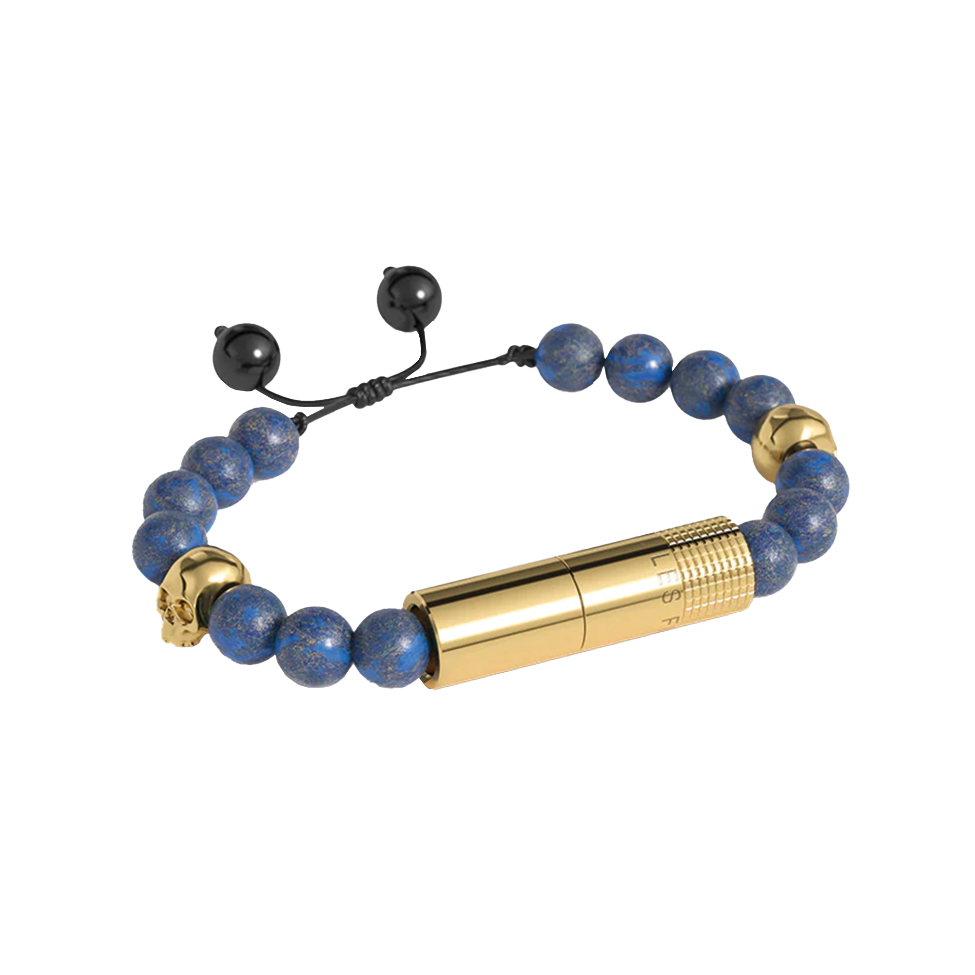Make a statement of style and individuality with the Noche Gold Skull, featuring 8mm Lapis Lazuli beads, Gold Punch and skulls spacers, this eye-catching fashionable cigar accessory is a feast for the eyes!