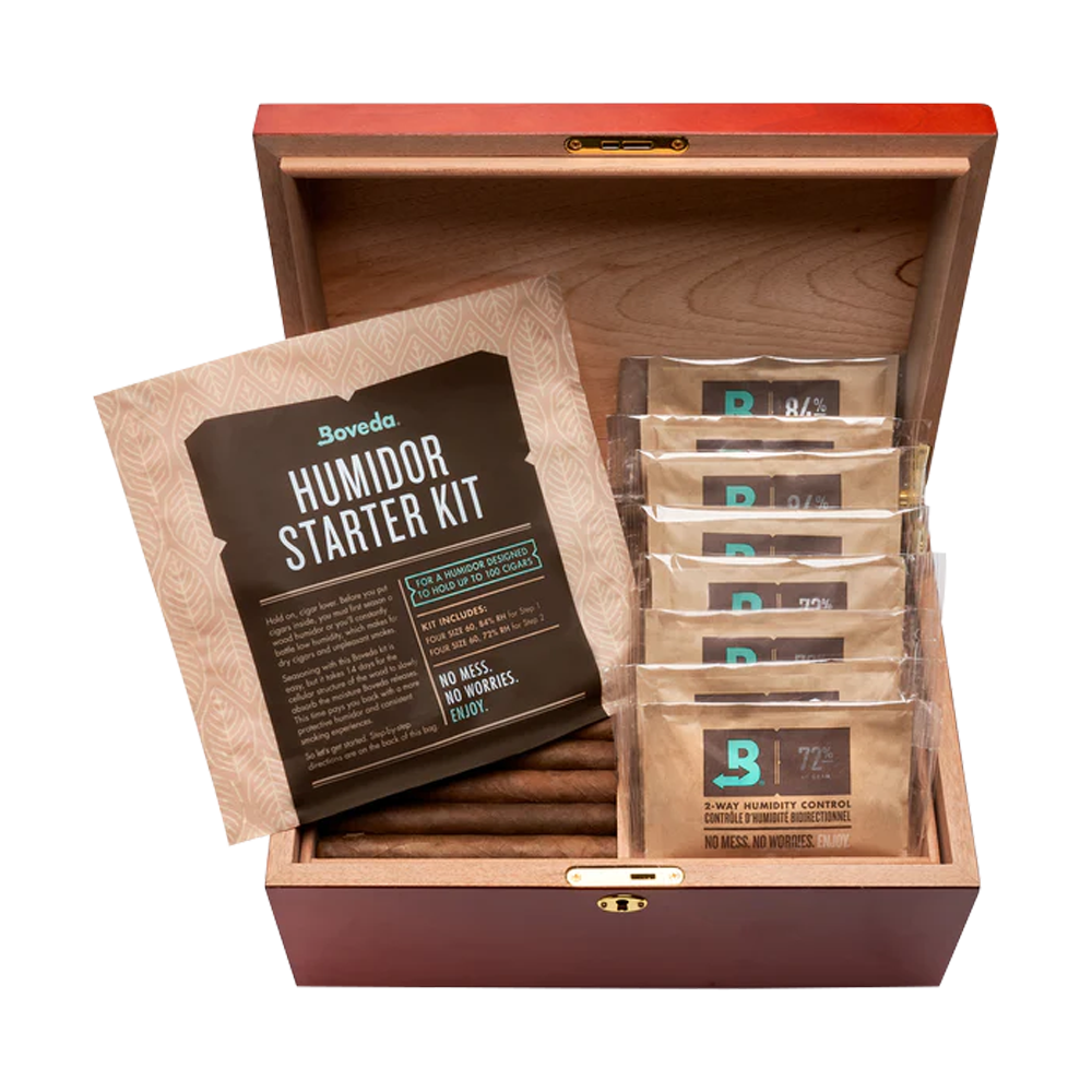 Want that classic wood humidor vibe without the hassle? The Boveda Humidor Starter Kit is your ticket. With four 84% RH packs for seasoning and four 72% RH packs for maintenance, it keeps your cigars primo for months. Ideal for wood humidors holding up to 100 cigars. Elevate your cigar game now – grab yours!