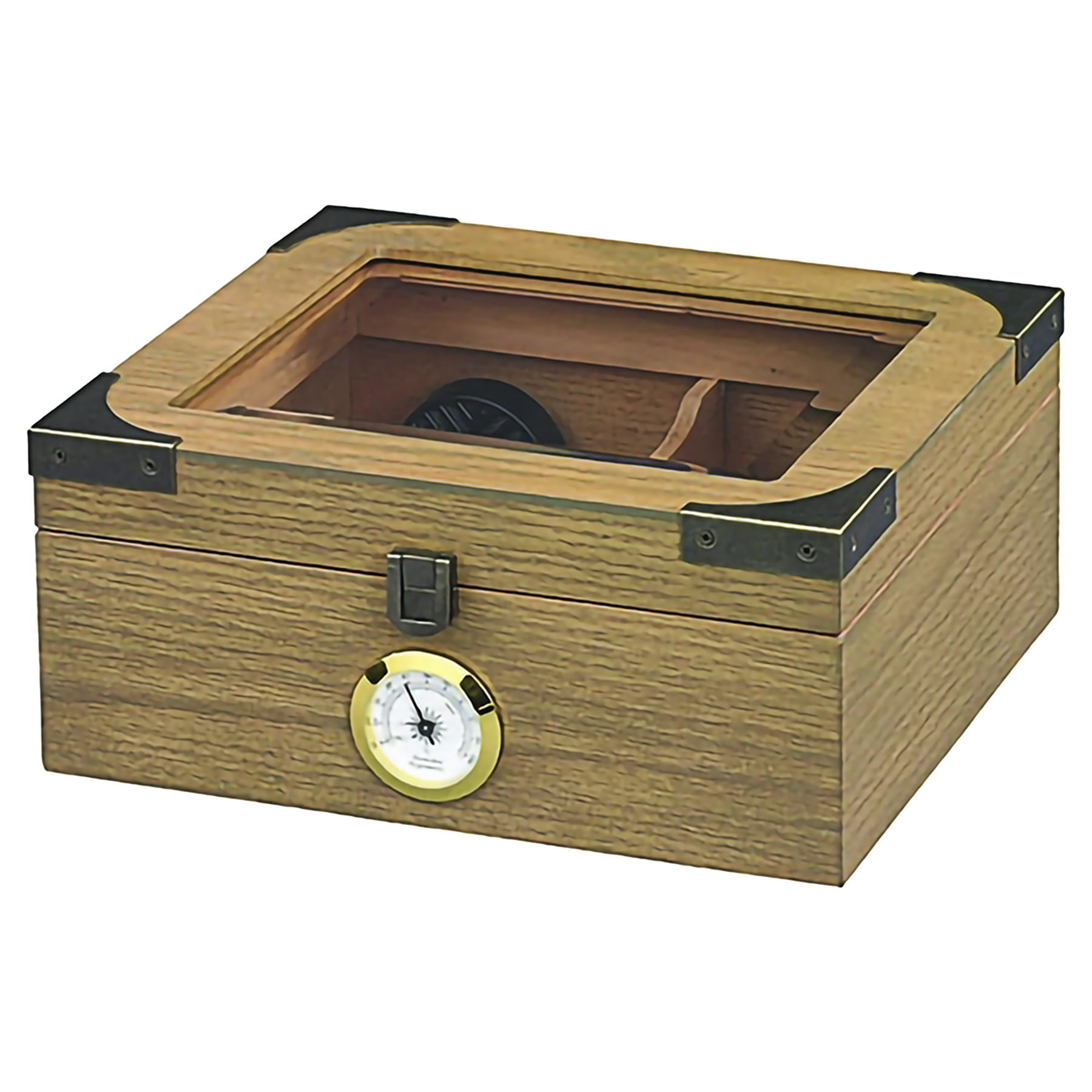 G'day, cigar lovers! Check out the Newport Glass Top Humidor—a luxurious 25-count stunner in white oak with a sleek glass lid. Lined with premium Spanish Cedar, it boasts a front mount hygrometer and SureSeal Technology for perfect closure. Complete with brass quadrant hinges, a humidifier, and an engraveable brass nameplate, it's the ultimate blend of style and functionality. Keep your cigars fresh and your style on point with the Newport Glass Top Humidor, mates!