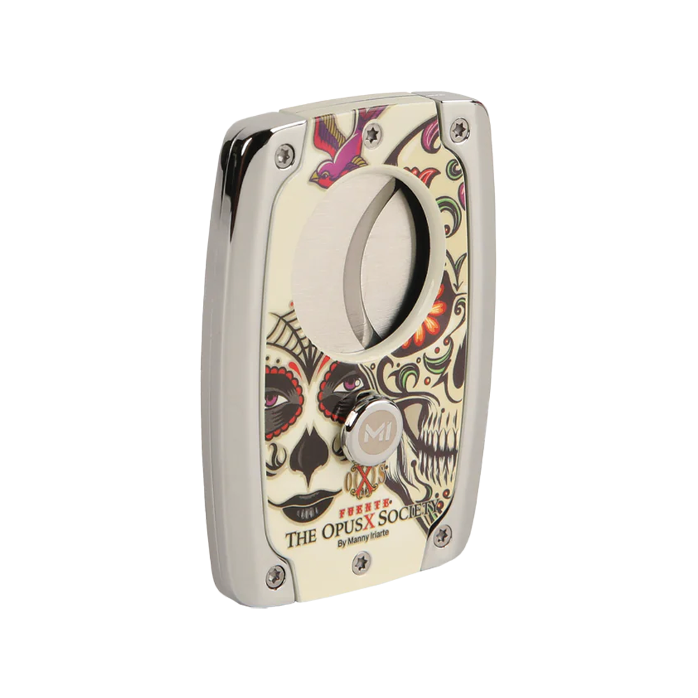 Hey cigar lovers, introducing the OpusX Society Sugar Cutter by Manny Iriarte. This vibrant Sugar Skull C30 Cutter is a real conversation piece, celebrating the spirit of The OpusX Society. It feels great in hand and delivers a consistently sharp, precise cut for your favorite cigar. Elevate your smoking experience with this unique and eye-catching cutter!