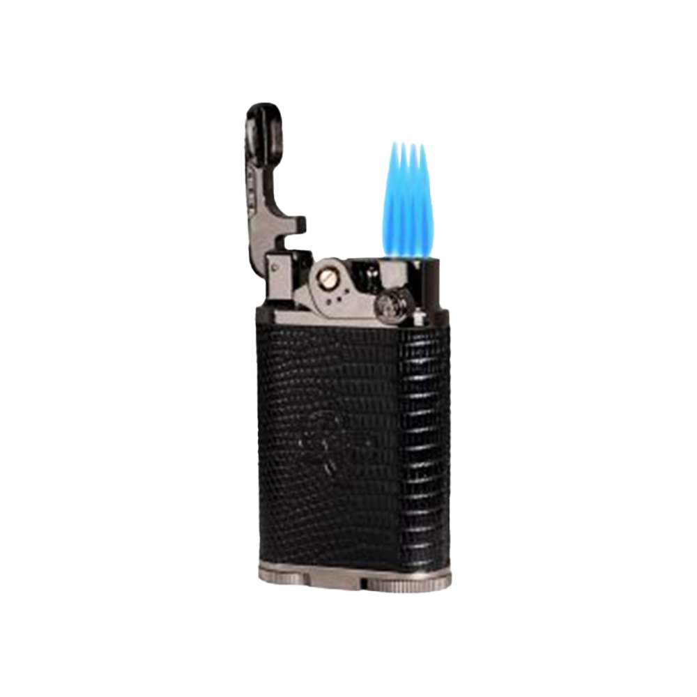 Introducing the Rocky Patel Davenport Black Lizard Leather Lighter! It features four powerful jets, a smooth ignition lever, and a flame height adjustment wheel. With a removable punch cut and needle punch, it's versatile and convenient. Choose from three adventurous designs and enjoy the lifetime warranty included.