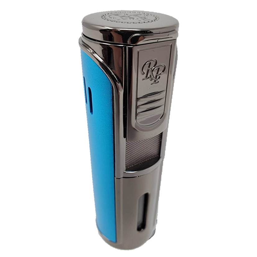 Introducing the Rocky Patel Envoy Lighter in Gunmetal & Teal. It features five powerful blue-flame jets for quick and efficient lighting. With a built-in punch cutter, fuel tank window, and sleek RP logo, it's both stylish and functional. Backed by a lifetime warranty, it's the perfect companion for cigar aficionados.