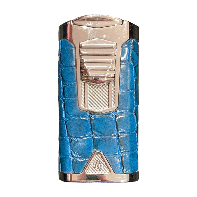 Introducing the Rocky Patel Statesman 3 Flame Lighter in Brush Nickel & Blue Leather, perfect for cigar aficionados. With three inward angled jets and adjustable flame height, it offers precision and convenience. The sleek crocodile-style leather adds sophistication.