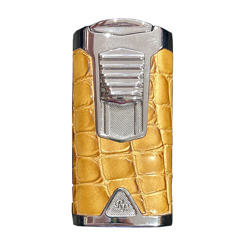 Get ready to light up with the Rocky Patel Statesman 3 Flame Lighter in Brush Nickel & Camel. It features three inward angled jets for a swift, precise light. With a punch cutter and adjustable flame height, it's perfect for on-the-go cigar aficionados. The sleek crocodile-style leather adds sophistication, backed by a full lifetime warranty.