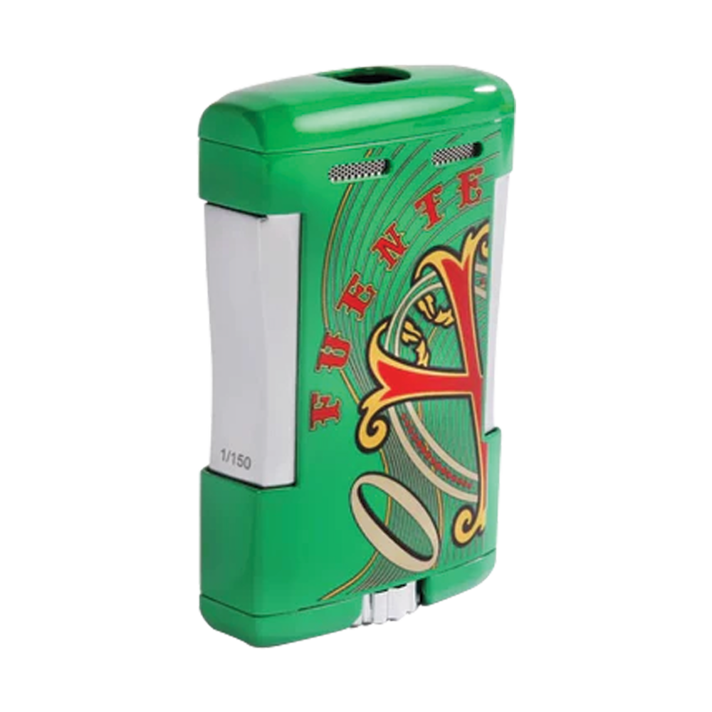 Hey, cigar lovers! Meet the OpusX Society Tabletop Lighter in Green—a vibrant addition to your collection. It features three powerful flames for quick, even lighting and showcases the bold Fuente OpusX Society logo.