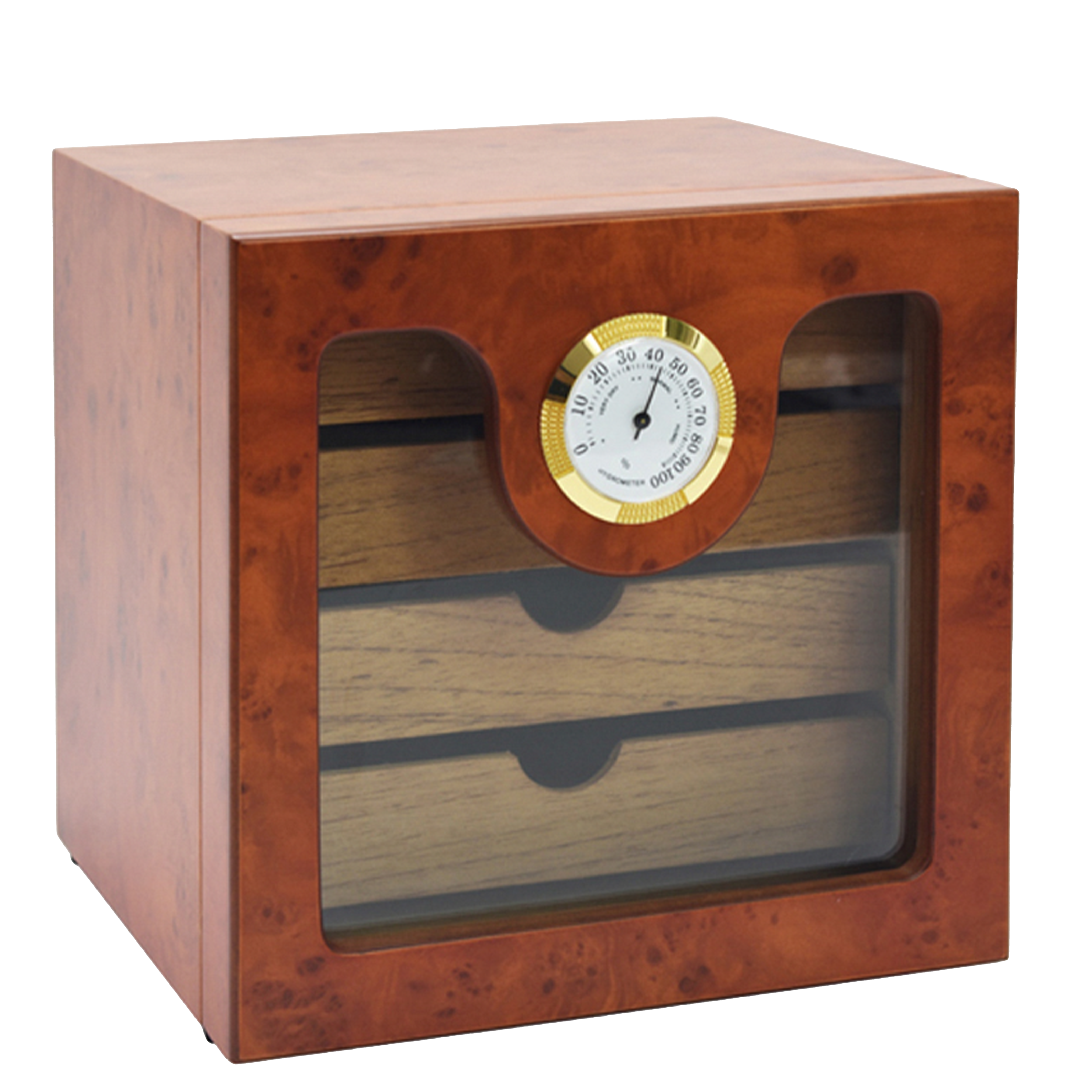 Hey cigar lovers, meet The President 50 Stick Burl Humidor with Glass Door—a classy solution for your cigar storage needs. With four burlwood trays, it holds up to 50 cigars, keeping them fresh and flavourful. The sleek glass door lets you showcase your collection in style. Elevate your cigar game today with The President humidor!