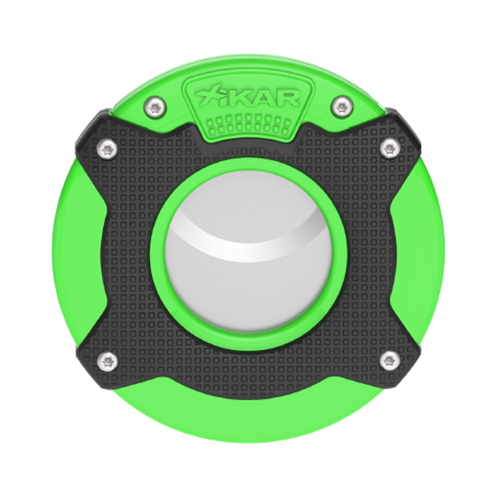 Introducing the Xikar Enso Green Cutter. It features double-guillotine stainless steel blades for precise cuts. The durable wrap-around armor protects it from wear and tear. Slim and portable, it provides a clear view of the cigar cap while cutting.