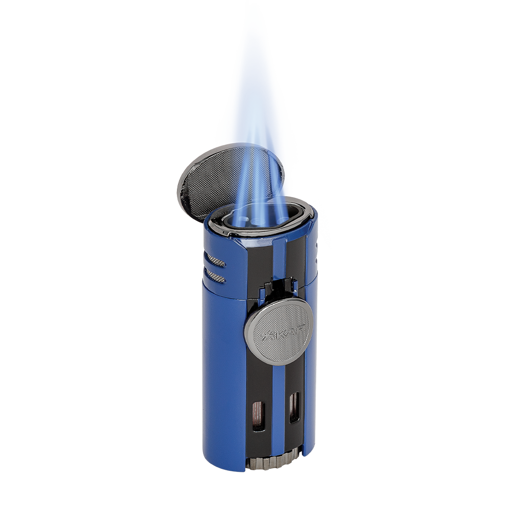 Introducing the Xikar HP4 Quad Lighter in Blue - the ultimate in lighting performance! Inspired by supercars, it's designed for top-notch performance. With features like an in-line fuel adjustment wheel and oversized EZ-View™ red fuel windows, it delivers precise flames for effortless cigar lighting. Say goodbye to struggles and hello to a perfect lighting experience!